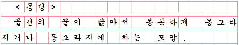 '물건의 끝이 닳아서 몽톡하게 몽그라지거나 몽그라지게 하는 모양'이다.