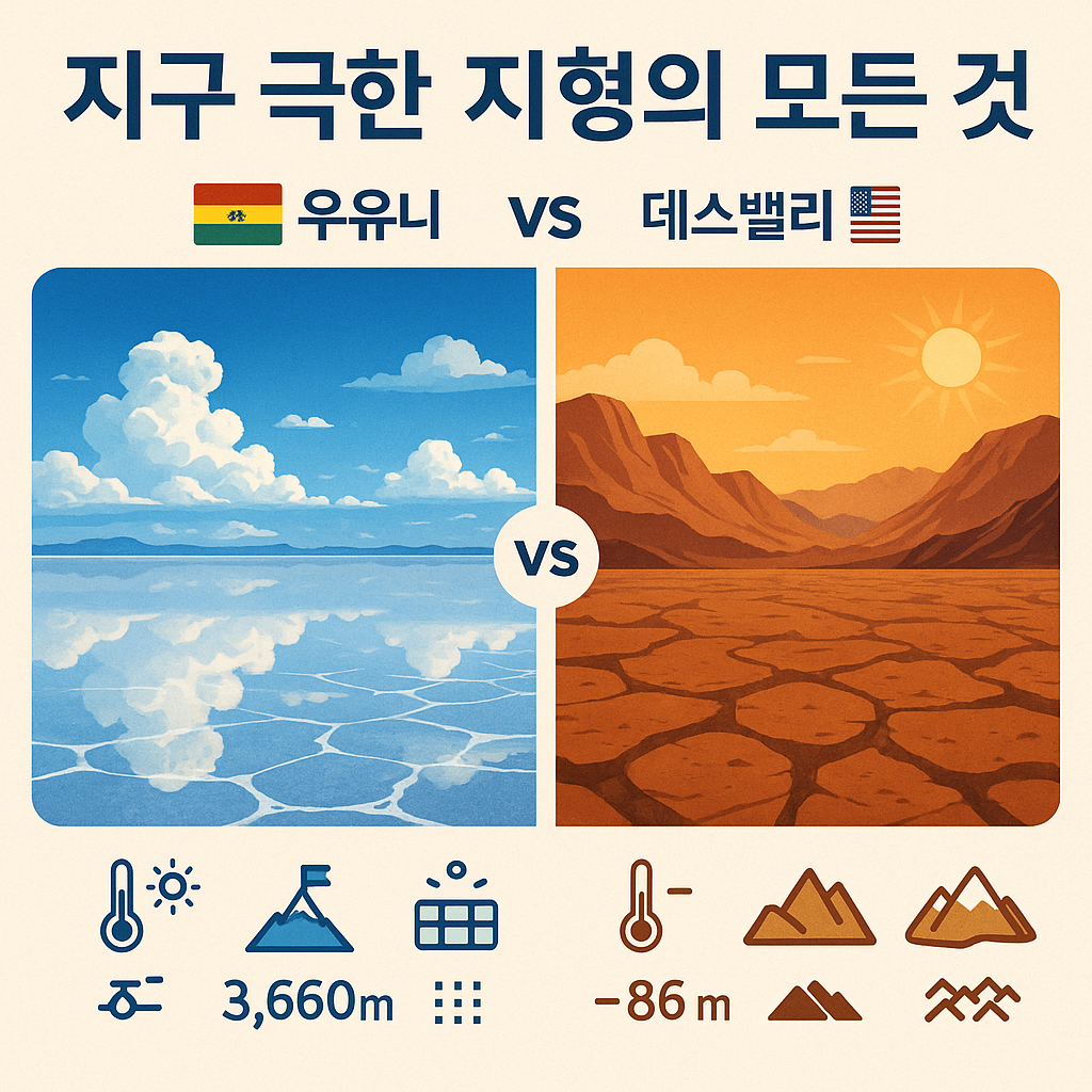 자연은 우리가 상상하는 범위를 넘는 풍경을 만들어냅니다. **남미의 우유니 소금 사막**과 **북미의 데스밸리(Death Valley)**는 지구에서 가장 아름답고도 극한적인 장소 중 두 곳입니다. 이 글에서는 두 지형의 기후, 위치, 생성 원인, 관광 포인트를 비교해 봅니다.