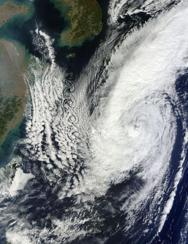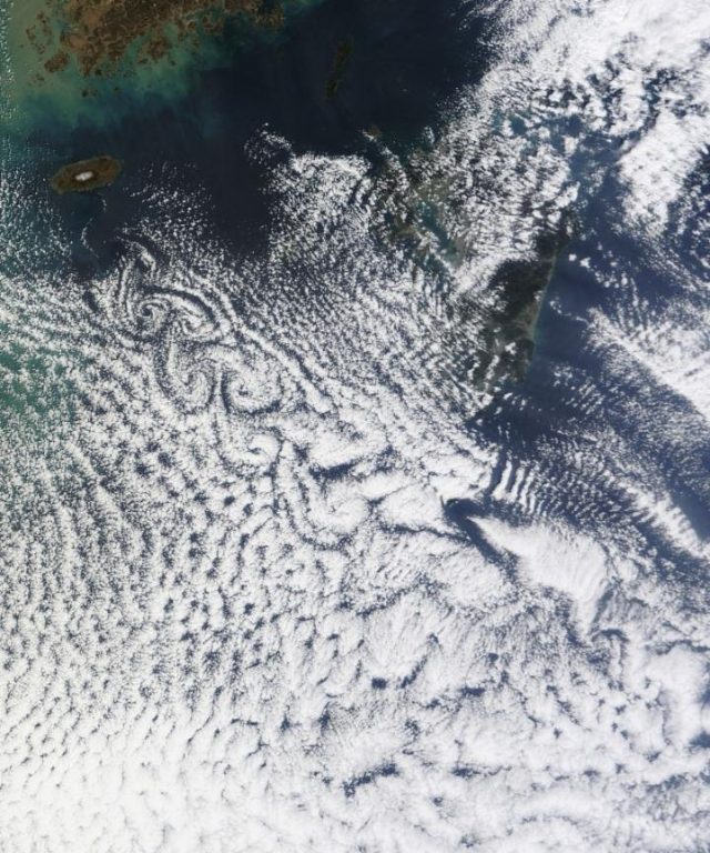 위 사진에서 보이듯이 제주도 남쪽으로 구불구불하게 구름이 꼬이듯 펼쳐지는 현상을 볼 수 있습니다. 기류가 한라산을 통과하는 과정에서 꼬불꼬불해지는 것입니다.