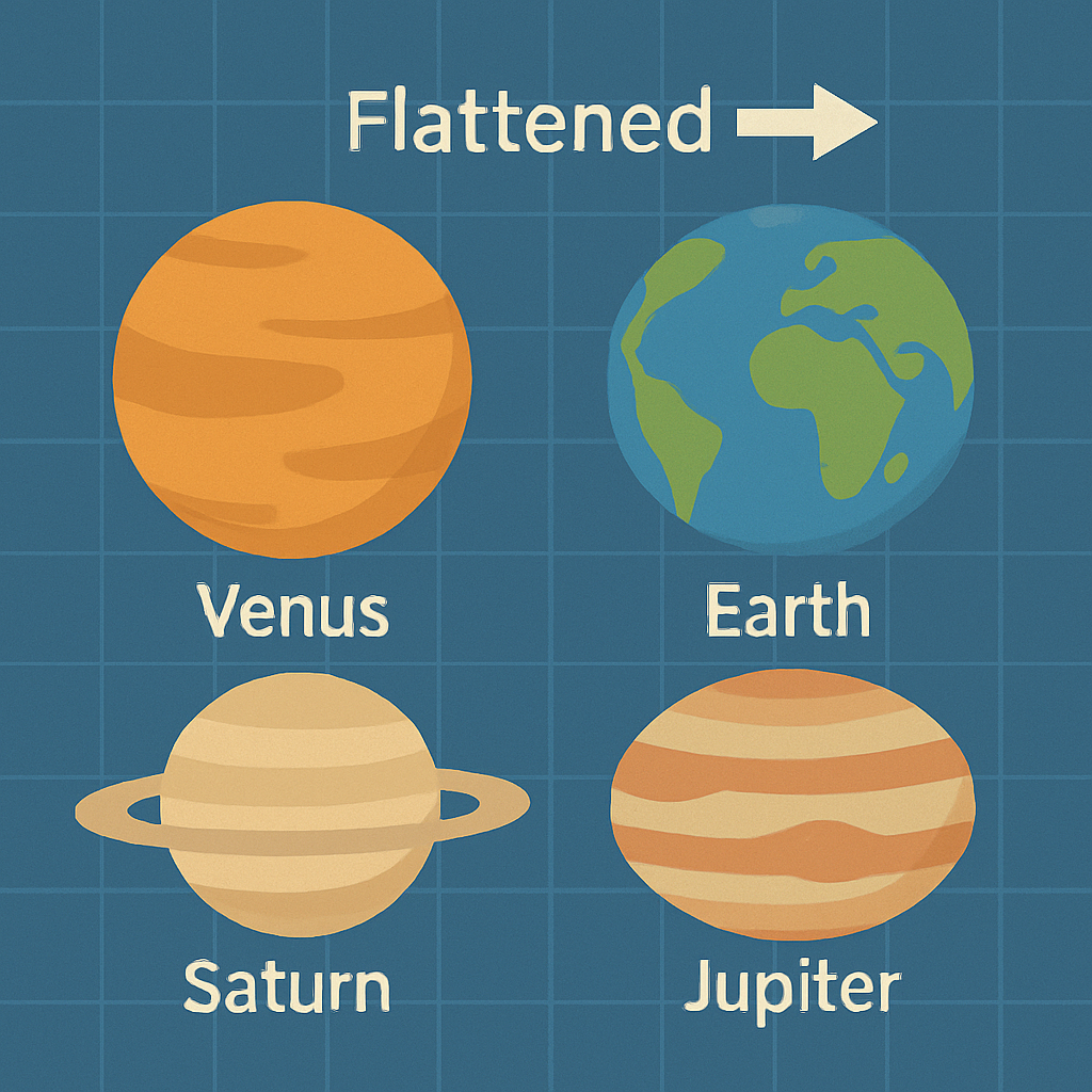 행성은 자전할 때 적도 방향으로 원심력이 작용합니다. 이 힘은 내부 물질을 밀어내 적도를 팽창시키고, 극은 상대적으로 눌리면서 전체가 납작해지는 것이죠.