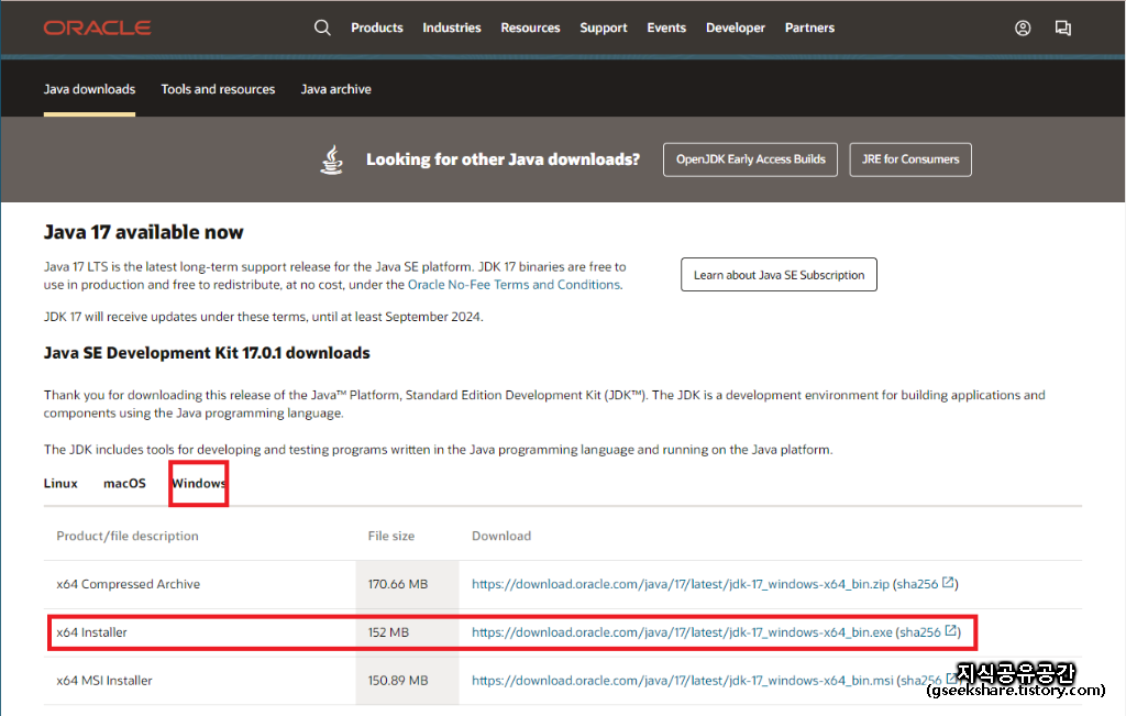 위 링크를 클릭하여 최신 버전의 JDK를 다운로드할 수 있는 화면으로 갑니다.