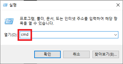 "실행"을 선택하면, 아래와 같이 "cmd"를 입력하고 Enter를 합니다.